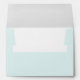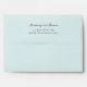 This wedding envelope features a minimalist design with a soft, pastel blue background. The layout is centred and elegant, showcasing the names in a flowing cursive script above an address written in a clean serif font. The monochromatic colour scheme enhances readability while maintaining a sophisticated look. Perfect for couples seeking a classic and timeless aesthetic, this envelope combines simplicity with refined style, making it ideal for formal occasions.
