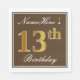 This simple and elegant paper napkin design features a message like "NameHere’s 13th Birthday" (with the "13th" having a faux gold-like colouring) within a brown-coloured square area featuring a simple border outline. The name is in a white-coloured script-like text, and can be personalized. Napkins like these could perhaps be used at a birthday party for somebody who is celebrating their thirteenth birthday. [~Z0000139]
