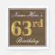 This simple and elegant paper napkin design features a message like "Name-Here’s 63rd Birthday" (with the "63rd" having a faux gold-like colouring) within a brown-coloured square area featuring a simple border outline. The name is in a white-coloured script-like text, and can be personalized. Napkins like these could perhaps be used at a birthday party for somebody who is celebrating their sixty third birthday. [~Z0000139]