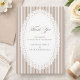 Elegant wedding thank you card featuring mocha brown French stripes and a delicate lace doily oval frame in a timeless mocha palette. A refined, minimalist design perfect for classic, vintage, and neutral wedding stationery suites.
