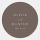 This elegant wedding sticker features a minimalist design with a solid chocolate brown background, creating a sophisticated and contemporary look. The typography combines bold serif letters for the names with a delicate script font for "and," adding an intimate touch. Below, the date is presented in clear sans-serif type, ensuring readability while maintaining the overall refined aesthetic. Perfect for personalizing your big day, this sticker captures the essence of understated elegance and celebration.