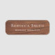 Elegant name tag with your name and title on a printed, brown wood grain background.