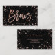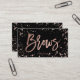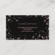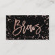 A modern, stylish lashes, eyes brows business card with modern hand lettering style brush typography in faux rose gold foil on a rose gold confetti splatters with customizable black background.
