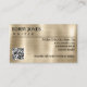 An elegant business card featuring a faux brushed pearl foil background, black text, and a QR code.