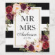 Elegant Watercolor Burgundy Marsala Blue Floral Black and White Striped Gold Frame Wine and sparkling wine Bottle Labels