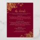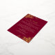 Ces magnifiques cartes de détails mariages arborent un titre de script élégant avec des swashes délicats ou fleuris sur les extrémités des lettres imprimées en papier or véritable. Des boucles et des tourbillons délicats sont disposés dans les coins, le tout sur un arrière - plan bordeaux, marron ou rouge vif. Le centre de la carte est une grande zone de texte où vous pouvez fournir toutes les informations dont vos invités pourraient avoir besoin, y compris des informations sur les réservations d'hôtel, rsvp, réception, registre, site Web, ou toute information dont vos invités peuvent avoir besoin.