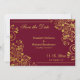 An elegant and ornate design with faux gold swirls and flowers. On a burgundy background, this is a beautiful save the date card. The offset text copies the lines of the the flourishes and swirls in the decorative side pattern. If you've decided on burgundy, marsala, or claret as your main wedding colour, this is an excellent choice.