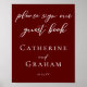 This personalized solid burgundy wedding PLEASE SIGN OUR GUEST BOOK poster features classic white script for a couple getting married in the evening. Celebrate your love with this romantic rich red colour and coordinate with our custom minimalist typography collection.
