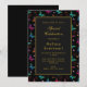 An elegant invitation for a birthday, reitrement, shower or other event. Designed with a fancy pattern of butterflies in many bright colours, contrasting very nicely on the black background. Whimsical florals, sprigs and leaves add a touch of fun. Layered over top is a black frame with a gold border and the invitation text is also written in a gold colour.