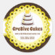 © 2021 Socialite Designs. Elegant cake bakery sticker design incorporating a chocolate brown damask pattern background, yellow scalloped border banner for your text, and a custom cake with swirls and floral design elements.