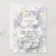 Elegant floral celebration of life/memorial service/funeral invitation featuring the event details in a beautiful script font and a floral background of purple flowers, calla lilies and greenery on the front and at the back.