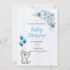 It's a cart for a Baby Shower invitations has a little cute cat with a three bleu balloons and a plant calyptus and a blue flowers