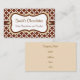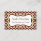 Une élégante motif marron chocolat et blanche orne cette carte de visite élégante. Customisez ce carte de visite pour répondre à vos besoins. Ajoutez ou supprimez des informations, changez le style de police, la taille de police, etc...Le design est de l'art original. Utilisez ce carte de visite élégant pour un spa, salon, petite entreprise, décoration maison, planificateur d'événements, boulangerie, confiserie, chocolatier, glacier, café, café, etc...