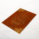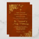 This beautiful wedding invitation is designed for a Catholic ceremony with a nuptial mass. It features real foil printing on a marbled rust orange or burnt sienna coloured background. The beautiful design has fancy script lettering with ornate curls and swirls in the corners. Stylish, elegant, sophisticated, and chic, this invitation is fancy and glam.
