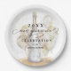 Stylish New Year's Eve party paper plates feature a watercolor champagne bottle and gold and white balloons with your details in chic lettering.