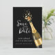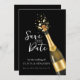 An elegant black and gold Save the Date design featuring a popping champagne bottle, symbolizing celebration and timeless romance. The dark background paired with golden accents creates a luxurious, modern wedding aesthetic perfect for formal, evening, or upscale city weddings. Ideal for couples seeking a classy yet bold announcement that sets the tone for a chic and memorable wedding celebration.