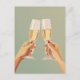 Two hands holding champagne flutes in a celebratory toast against a soft pastel background. The scene captures an elegant and joyful New Year’s Eve moment with golden bubbles rising in the glasses.