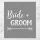 SIMPLE, CLASSY AND ELEGANT BRIDE + GROOM LETTERING IN WHITE ON A GRAY BACKGROUND PAIRED WITH A TRENDY DECORATIVE ARROW ELEMENT