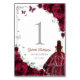 Burgundy, silver and white Quinceanera celebration table number cards. Features brunette girl in ball gown dress, script font, silver butterflies, dark red roses and tiara. Perfect for an elegant princess style glam celebration. Personalize with your own details.
