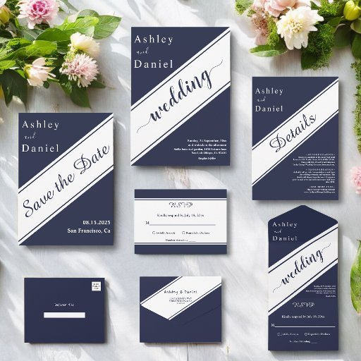 Elegant Chic Navy Blue White Luxury Modern Wedding All In One Invitation