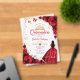 Red gold Quinceanera celebration acrylic invitation. Features brunette girl in ball gown dress, script font, gold butterflies, roses and tiara. Perfect for an elegant princess style glam celebration. Personalize with your own details. Stylish transparent or frosted acrylic invitations.