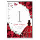 Red silver and white Quinceanera celebration table number cards. Features brunette girl in ball gown dress, script font, silver butterflies, red roses and tiara. Perfect for an elegant princess style glam celebration. Personalize with your own details.