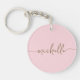 Porte-clés personnalisé élégant et sophistiqué avec monogramme doré et nom en écriture cursive rose pastel pour fille. Ces modèles minimalistes simples présentent votre prénom dans un joli style de lettrage manuscrit avec une typographie à queue en forme de signature (ou calligraphie) en couleur or sur un fond rose pastel ou rose clair. Très facile à personnaliser. Cadeau féminin élégant pour une pendaison de crémaillère, mais aussi pour un anniversaire, un mariage, la fête des mères, un enterrement de vie de jeune fille, une baby shower, une fête d'anniversaire pour les 16 ans, pour une fête de fin d'études et c'est pour la fille qui aime les choses uniques et élégantes.