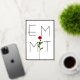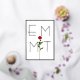 A simple red rose decorates the custom monogram with slender text.