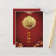 Golden Ox into a golden circle with Ox ideogram and "Year of the Ox" + "Happy Chinese New Year" in English and Chinese (calligraphy) on a delicate dark red background with peonies and Chinese fan. Design on vertical holiday postcard. Matching greeting card and more... Perfect for Chinese New Year of the Ox 2021.