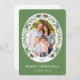 This festive Christmas holiday card features an oval photo frame adorned with winter greenery and red berries on a light green background. Personalize this modern elegant holiday card by adding your photo, family name and your own message, or use the message shown.