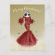 Elegant illustration of a modern woman in a red dress full of roses. Background is a sparkling gold. The words "Merry Christmas!" are written in a trendy calligraphy.