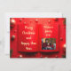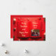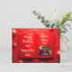 Elegant Christmas photo card design featuring a vibrant red background with golden ornaments, festive pine branches, and a centred photo frame on an open-book style layout. Customizable with your family name and year, this holiday greeting card is perfect for sending warm Merry Christmas wishes to friends and loved ones. A beautiful blend of modern minimalism and timeless Christmas charm.