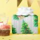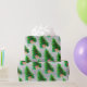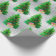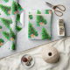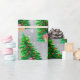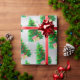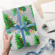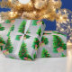 This elegant holiday wrap features diagonal rows of a watercolor evergreen Christmas tree decorated with a string of red ornaments. Beneath the tree are a couple of brightly wrapped packages. A starry silver background is the perfect foil for the holiday scene.