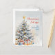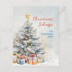 An elegant Christmas tree in vintage watercolor is shown on this lovely holiday postcard. Pretty gold baubles highlight the snowy pine and the topper is a bright star. Pretty gifts and packages surround the base of the tree. The greeting on the front of the postcard is "Christmas Tidings", although you can change that to another seasonal greeting if you prefer. Be sure to edit the example family name and date.