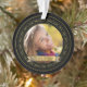 Graduation keepsake ornament featuring a swirled flourish circular frame and banner in black and gold tone for you to personalize with your photo, name and class year on front. On back is our original grad cap illustration and additional space for you to personalize with your school name and other special text such as "Class President" or "Class Valedictorian".