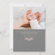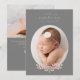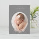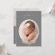 This beautifully simple and elegant birth announcement has a single oval photo on front with classic typography details for the baby's name and statistics including birth date, weight, and length. Soft pastel floral detailing in a blush pink coral pastel and soft periwinkle blue dots. The back side includes a space for optional custom personalized family message and large rectangular second photo.