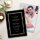 This wedding invitation features an elegant classic design accented with a gold foil border on a black background. The reverse side offers space for a full photo.