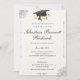 Featuring a classic white background with refined floral corner accents, this invitation boasts a sophisticated script font style and a tasteful black and gold colour scheme. The design includes a symbolic graduation cap and scroll graphic, adding a touch of tradition to your celebration. Personalize the text to invite family and friends to the ceremony and celebration, ensuring your graduate's special day is beautifully commemorated. Crafted on high-quality textured paper, this invitation is the perfect way to mark this milestone with style and grace.