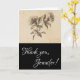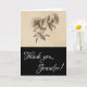 This elegant thank-you card design features the message "Thank you" on the front, along with a personalized recipient name. It also features a vintage style depiction of flowers. The inside features an editable thank you message, or it could be cleared and left blank if a message is to be written by hand instead. A thank you card like this could be used to express gratitude for something that someone has done.