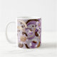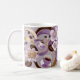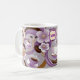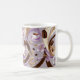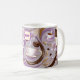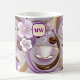 This coffee mug showcases a chic and refreshing design that highlights coffee-themed artistry with flowers and ribbons. The pattern includes steaming coffee cups and coffee beans, all elegantly arranged on a soft lavender background with subtle striped textures. Accentuating the design are luxurious golden and lavender ribbons, creating a sense of sophistication and charm. At the centre, a monogram enclosed in a lavender-framed emblem can be personalized with initials, making this mug an ideal choice for a customized gift or a stylish addition to a coffee lover’s collection.
