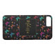 Customized phone case designed with an elegant pattern with a graphic illustration of fluttering butterflies in many bright colours, contrasting very nicely on the black background. Whimsical florals, sprigs and leaves add a bit of charm. A black frame with a gold coloured border layered over top with your personalized text inside.