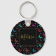 Custom keychain personalized with your name. Designed with an elegant pattern with a graphic illustration of fluttering butterflies in many bright colours, contrasting very nicely on the black background. Whimsical florals, sprigs and leaves add a bit of charm. A black frame with a gold coloured border layered over top with your personalized text inside.