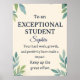 Featuring a soft parchment-style background with watercolor leaves and gold accents, this card delivers a heartfelt message: “To an EXCEPTIONAL STUDENT – Your hard work, growth, and positivity have made an impact. Keep up the great effort.”