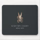 Chic personalized mousepad for your salon or hairstyling business features two lines of custom text in classic white lettering, on a soft black background adorned with a pair of flower-embellished scissors in faux copper foil.