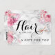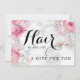 Modern and elegant gift certificate for hairstylists with faux copper rose gold scissors, pink and white roses, white marble background and elegant calligraphy font.