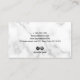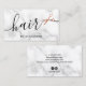 This modern hairstylist business card design features faux copper rose gold scissors, white marble background and elegant calligraphy font.