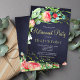 Rustic style retirement party stylish invitation template on dark midnight navy blue chalkboard background featuring big pink and coral red peony roses with teal blue and sage green foliage and leaves and white and golden script lettering. ++++++++ The invitation is suitable for spring summer or autumn fall outdoor garden or backyard rustic country retirement or other occasions celebrations. --- If you need assistance, please contact me!