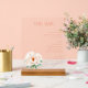 This elegant wedding menu features a minimalist layout with a clean, white background that highlights the warm coral title "THE BAR" and lists of beverages in muted orange-brown text. The design includes a delicate illustration of white peonies on the left, adding a touch of natural beauty to the sophisticated aesthetic. With its structured hierarchy and refined color palette, this menu is perfect for an upscale event, creating an inviting atmosphere while showcasing beer, wine, and spirits options.