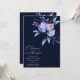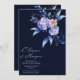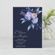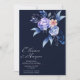 This elegant corner peony wreath navy blue wedding invitation is perfect for people who love an elegant navy blue/ dark blue wedding invitation. This floral wedding invitation features the dusty blue peony rose ribbon floral bouquet element at the right top corner. The calligraphy has done at the left bottom corner. This is a beautiful gorgeous pretty wedding invitation. It also features a modern classy rich sophisticated look. The leaves have given an added botanical look. It's simple and elegant. The dark colour theme has been given to the card. The dusty blue peony flower bouquet gives a shiny appearance to the wedding invitation as it is placed on a dark blue/ navy blue background.