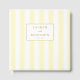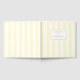 This wedding guest book features a minimalist and modern design with vertical cream and pale yellow stripes, creating an elegant contrast. The layout centres around a small gold-bordered frame that highlights the names "Lauren and Benjamin" in classic serif typography, perfect for personalization. Scattered gold confetti accents add a festive touch to the sophisticated aesthetic, making it ideal for celebrating a special occasion like a wedding.